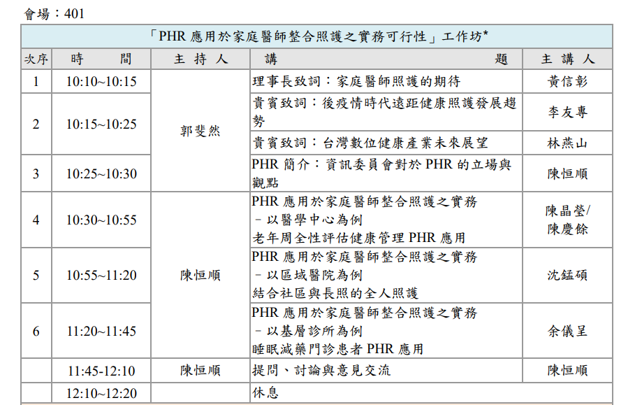 「PHR 應用於家庭醫師整合照護之實務可行性」工作坊